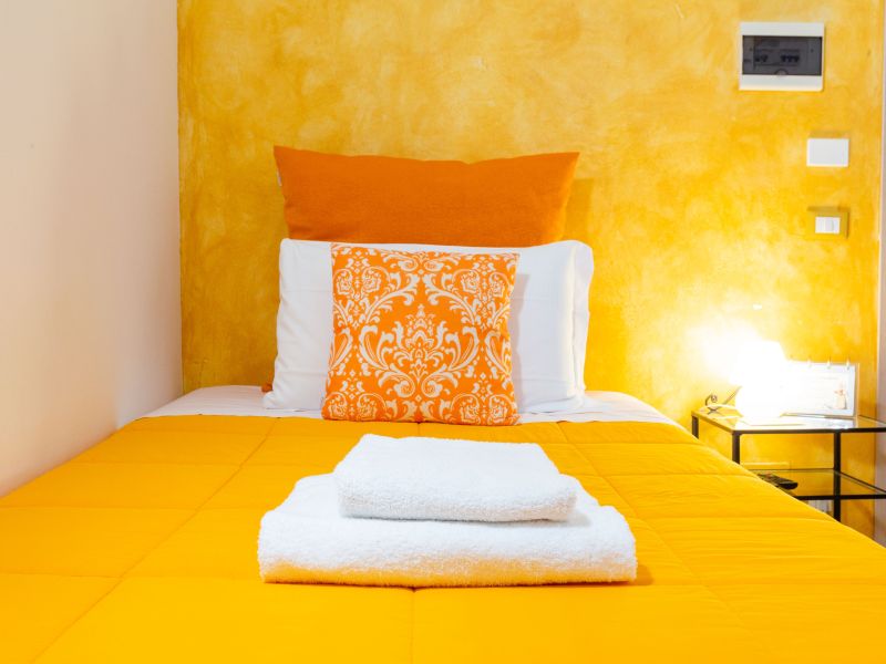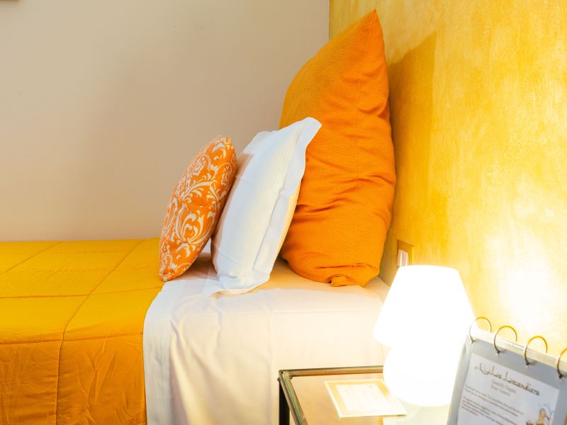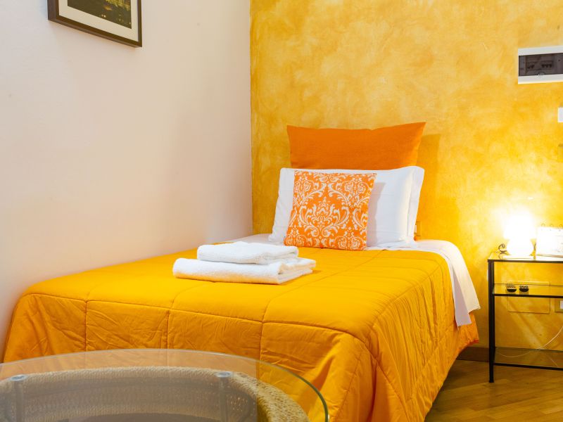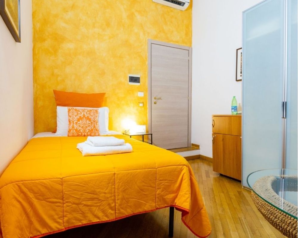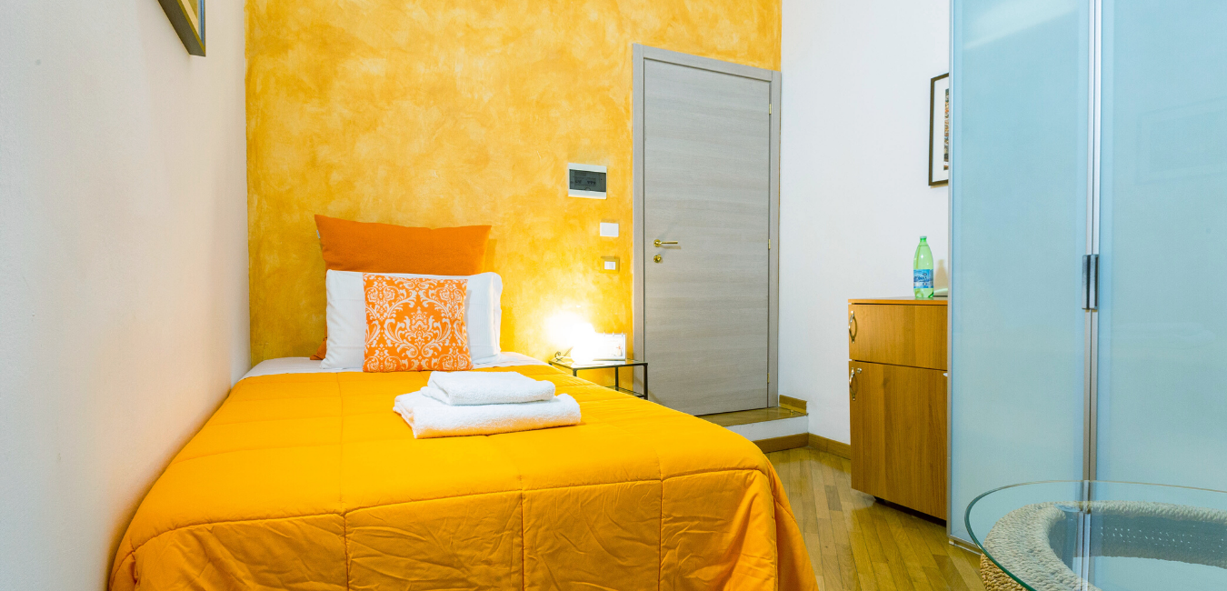 ... infonde una grande energia, sia mentale che fisica, colore estroverso, stimola il cambiamento e le novità è un colore molto positivo e regala una grande immaginazione, questo è il colore che abbiamo scelto per l’unica camera Singola che abbiamo, singola ma con letto francese ovvero da 1 piazza e mezzo, decisamente molto più confortevole del solito letto singolo, è una camera piccola ma molto accogliente, arredata con gusto e senza eccessi, il colore predominante appunto è il color salmone/giallo come i tendaggi, il copriletto, la porta del bagno privato e tutti gli accessori. Un caldo pavimento in parquet avvolge le stanze e l'ampia finestra offre una bellissima luce naturale, si affaccia su un grazioso cortile interno con giardino privato, molto silenziosa ma comunque dotata di doppi vetri e ben insonorizzata. In camera troverai un tavolino per la prima colazione che è servita dalle 8:00 alle 10:00 o per consumare il pranzo o la cena in intimità e in sicurezza. Come tutte le nostre camere è dotata di un mini-frigo, un bollitore elettrico e un vassoio con ampia scelta di Tè Twinings, Infusi Twinings e Caffè Nescafé. Ovviamente è presente il wi-fi gratuito e TV HD LCD e decoder con canali del digitale terrestre e satellitari. Se necessario, a disposizione la cassaforte e anche un piccolo asse da stiro, basterà richiedere il ferro da stiro alla reception. Dalla porta gialla si accede al bagno privato in marmo grigio con in dotazione tutto ciò che potreste avere bisogno.. asciugacapelli, vanity-set, set di bagnoschiuma e shampoo monouso, sapone.